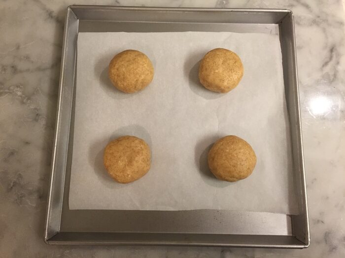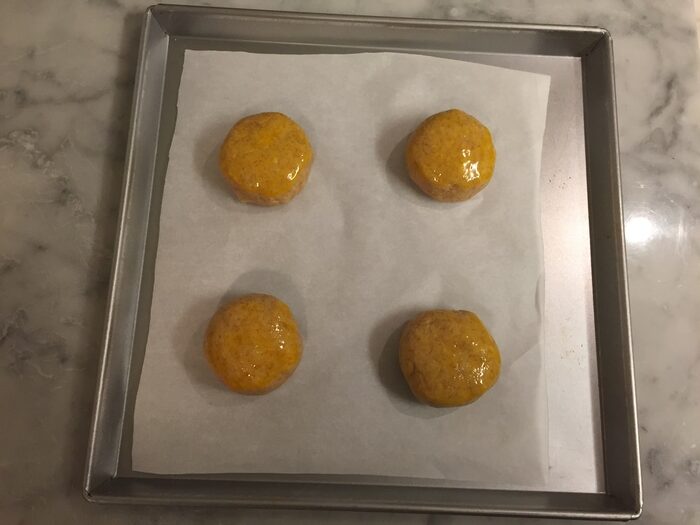 6.生地を丸めてから少し押して平らにし、シリコンペーパーを鉄板の上にひきスコーン生地を並べる